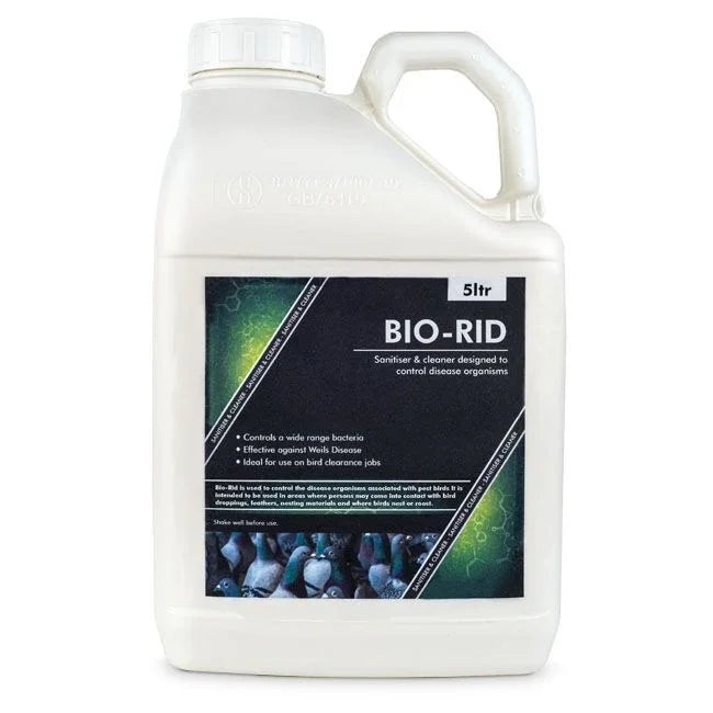 Bio-Rid is used to control the disease organisms associated with pest birds (ie Pigeons, Starlings, Sparrows gulls etc). It is intended to be used in areas where persons may come into contact with bird droppings, feathers, nesting materials and where birds nest or roost.