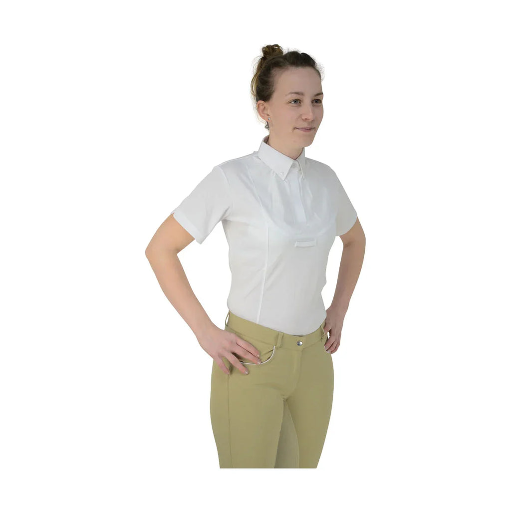 This short sleeved tie shirt is designed with CoolDry fabric to wick away moisture, ensuring you remain comfortable, confident and dry in the show ring. The bi-stretch material provides freedom of movement whilst riding. A traditional cotton front panel creates a smart appearance at all times, enhanced by the addition of the button collar and tie keeper.